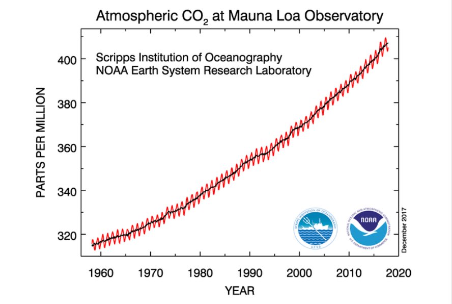 Graf koncetrácie Co2 (1950 - 2017) a jeho kolisajúci priebeh.(https://twitter.com/Sustainable2050/status/947791337461514241)