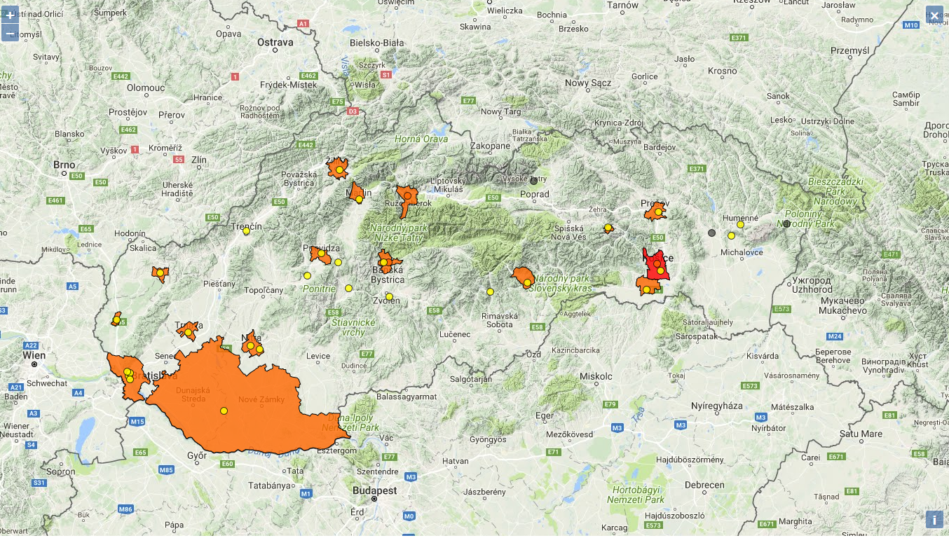 Mapa SHMÚ zobrazujúca úroveň znečistenia. Pre oblasti vyznačené oranžovou platí "upozornenie" na smogovú situáciu pre častice PM10, a pre červenú oblasť platí "výstraha" pred závažnou smogovou situáciou pre častice PM10. (http://www.shmu.sk/sk/?page=2264)