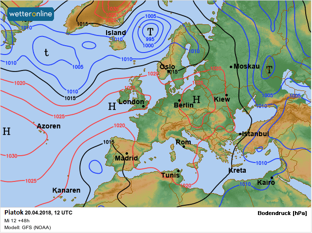 (Obr.1) Tlakové pole na piatok 20.4.2018. Nad strednou Európou bude dominovať tlaková výš, ktorá sa tu zdrží minimálne do nedele. (https://www.wetteronline.de/profiwetter/europa)