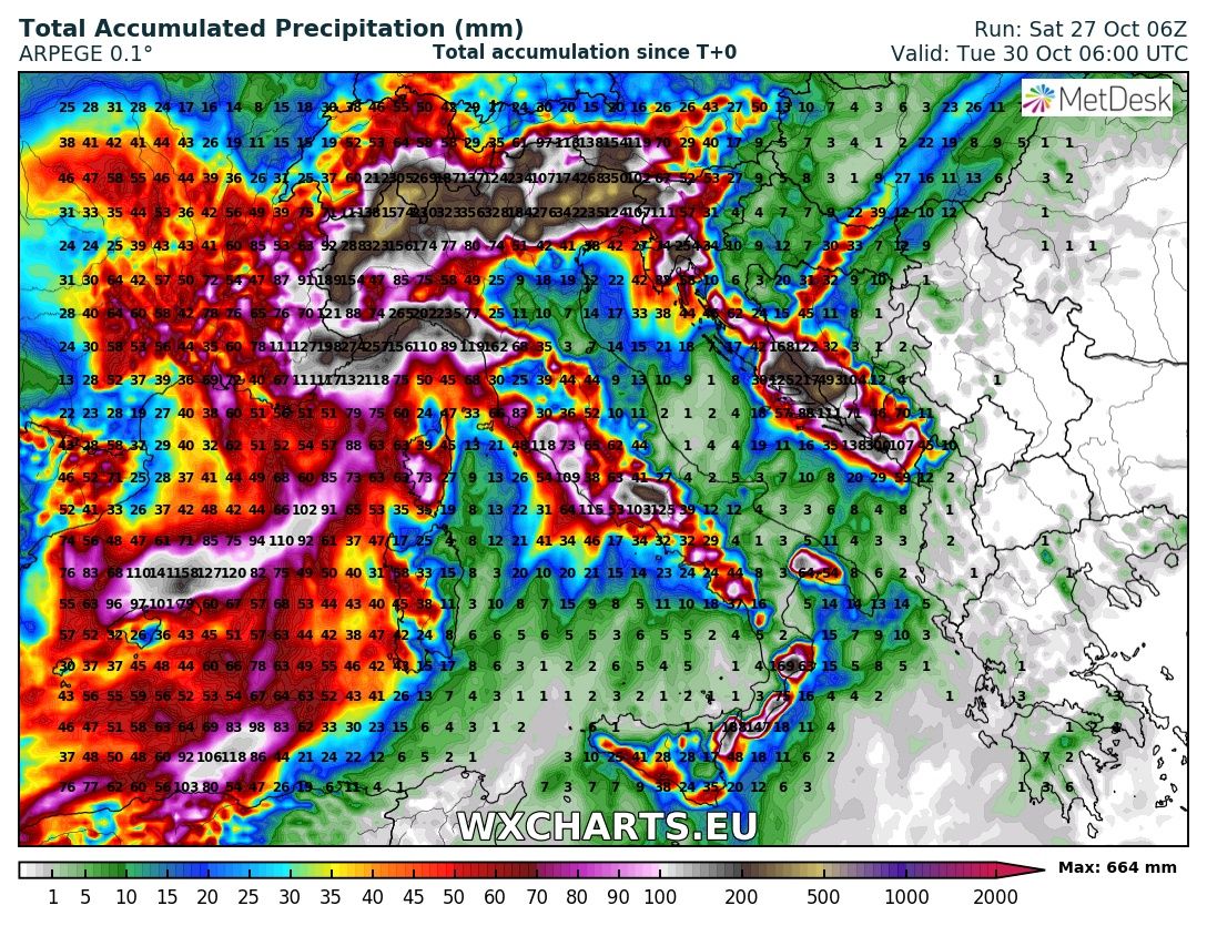 V Alpách sa najvýdatnejšie zrážky očakávajú v južnej časti Álp - a teda najmä na severe Talianska. Predpovedné modely očakávajú úhrny zrážok 200 až 500 mm za 72 hodín. Zrážková činnosť začala v Alpách už počas soboty (27.10.2018), kedy sa v danej oblasti nachádzal ešte chladný vzduch a jednalo sa teda ešte o sneženie - preto sa lokálne očakáva do nedele poobedia nová snehová pokrývka až do výšky jedného metra. V priebehu nedele začne od juhu prúdiť teplý vzduch, vďaka čomu už budú zrážky padať výhradne v tekutom skupenstve. Kvôli extrémne výdatným zrážkam je potenciál na veľké záplavy.