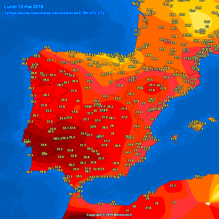Maximálne teploty na Pyrenejskom polostrove v pondelok 13. 5. 2019 (Zdroj: Meteociel)