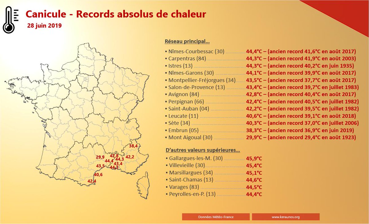 Na mnohých miestach na juhu Francúzska dnes teplota vystupovala nad 40 °C a práve tam dnes zaznamenali aj navyššiu nameranú teplotu v histórii meraní. Na stanici Gallargues-le-Montueux teplota vystúpila až na 45,9 °C, čím bol pokorený rekord z 12. augusta 2003 v Conqueyrac, kedy teplota vystúpila na 44,1 °C.