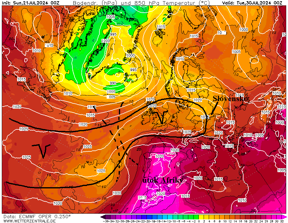 Hypotézou však zostáva nielen to, či sa predmetná tlaková výš bude trasovať tak, aby úder Afriky na našu oblasť povolila, ale tiež to, či prítomnosť tejto tlakovej výše nad západnou či severozápadnou Európou sa stane realitou - totiž, táto tlaková výš, tak, ako ju máme možnosť vidieť v úvodnom obrázku ako relatívne samostatnú entitu, je odtrhnutá od veľkoformátovej tlakovej výše napolohovanej nad vodami Atlantiku (to už prezentuje obrázok 1, ktorý je terminovaný k predposlednému dňu mesiaca júl 2024).