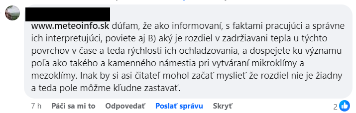 Vnímame, že v predkladanom druhom vydaní polemiky sme nereagovali priamo na FB-pripomienku uvedenú ako obrázok 1. Tak či onak, ako sme naznačili, práve táto pripomienka nás inšpirovala k druhému vydaniu polemiky - a toto vydanie podľa nás veľmi vhodne dopĺňa prvé vydanie polemiky. Platí však, že vyjdeme i s ďalšími vydaniami. A áno - určite si všimneme aj to, že kým počas páľavy a v čase, kedy teplota vzduchu počas dňa stúpa, je mestská zástavba "chladničkou", tak na druhej strane v čase, kedy už (na sklonku dňa) teplota vzduchu klesá, je zdrojom tepla. Alebo sa vyjadríme aj k tomu, že kým kamenné námestie sa v porovnaní so suchým zožatým poľom počas denných hodín problematicky zohrieva, tak na druhej strane sa na sklonku dňa alebo večer aj problematicky ochladzuje - kdežto pri zožatom suchom poli je to naopak.