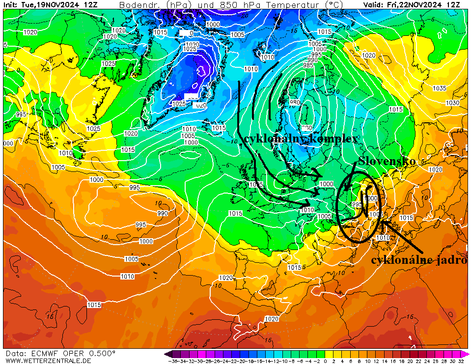 Obr. 1: Prízemné tlakové pole a výškové teplotné pomery v hladine cirka 1500 m n. m. k termínu piatok (22. 11. 2024) - numerický model ECMWF (iniciované 19. 11. 2024, 13:00 SEČ); zdroj: wetterzentrale.de