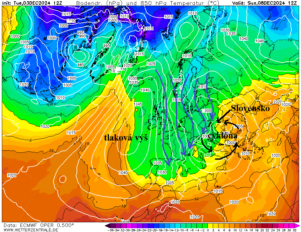 Obr. 1: Prízemné tlakové pole a výškové teplotné pomery v hladine cirka 1500 m n. m. k termínu nedeľa (08. 12. 2024) - numerický model ECMWF (iniciované 03. 12. 2024, 13:00 SEČ); zdroj: wetterzentrale.de